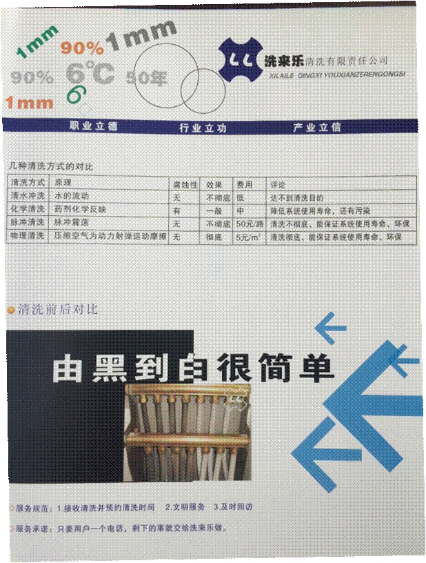 清洗方式的不同直接決定了清洗的效果,選擇清洗,較好的是物理射彈式清洗。射彈清洗所用的設(shè)備盡量是噪音低的,以免影響他人工作或休息。一支過硬的團隊是經(jīng)過正規(guī)培訓(xùn)上崗作業(yè)的,有很好的素質(zhì),服務(wù)態(tài)度好,清洗流程規(guī)范,專業(yè)性強;服務(wù)好的大公司一定會說明公司具體位置,以便業(yè)主隨時上門咨詢及考核,以及正規(guī)的信譽卡、反饋卡及收據(jù)等相關(guān)票據(jù),重要的是選擇正規(guī)公司售后服務(wù)更放心,更具有賠償損失的能力。為保護消費者權(quán)益,避免不正當(dāng)競爭行為給您造成損失請您慎重選擇清洗公司。