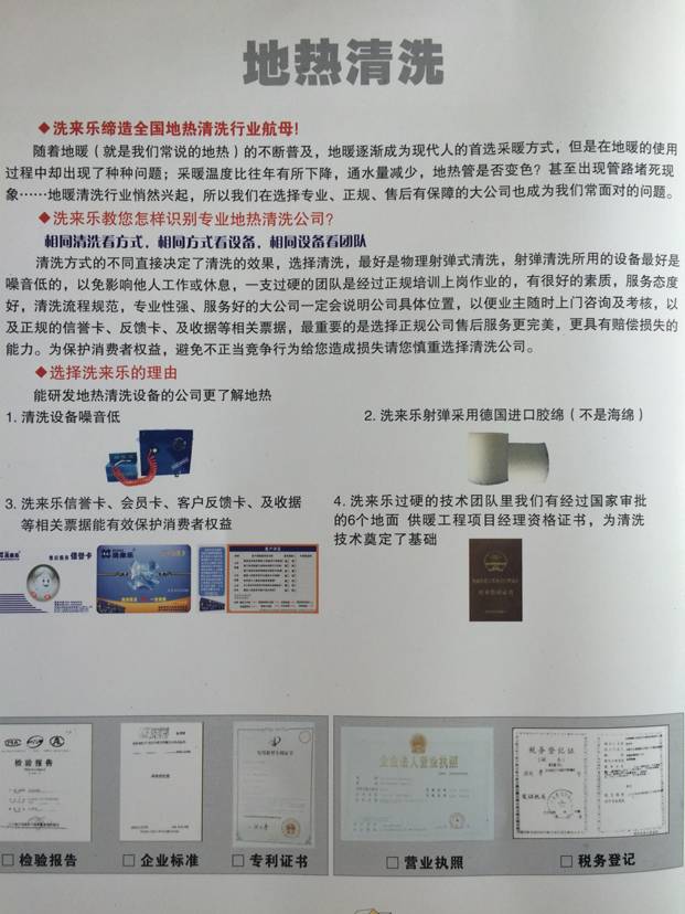 4.洗來樂過硬的技術(shù)團隊里,我們有經(jīng)過國家審批的6個地面供暖工程項目經(jīng)理資格證書,為清洗技術(shù)奠定了基礎(chǔ)。